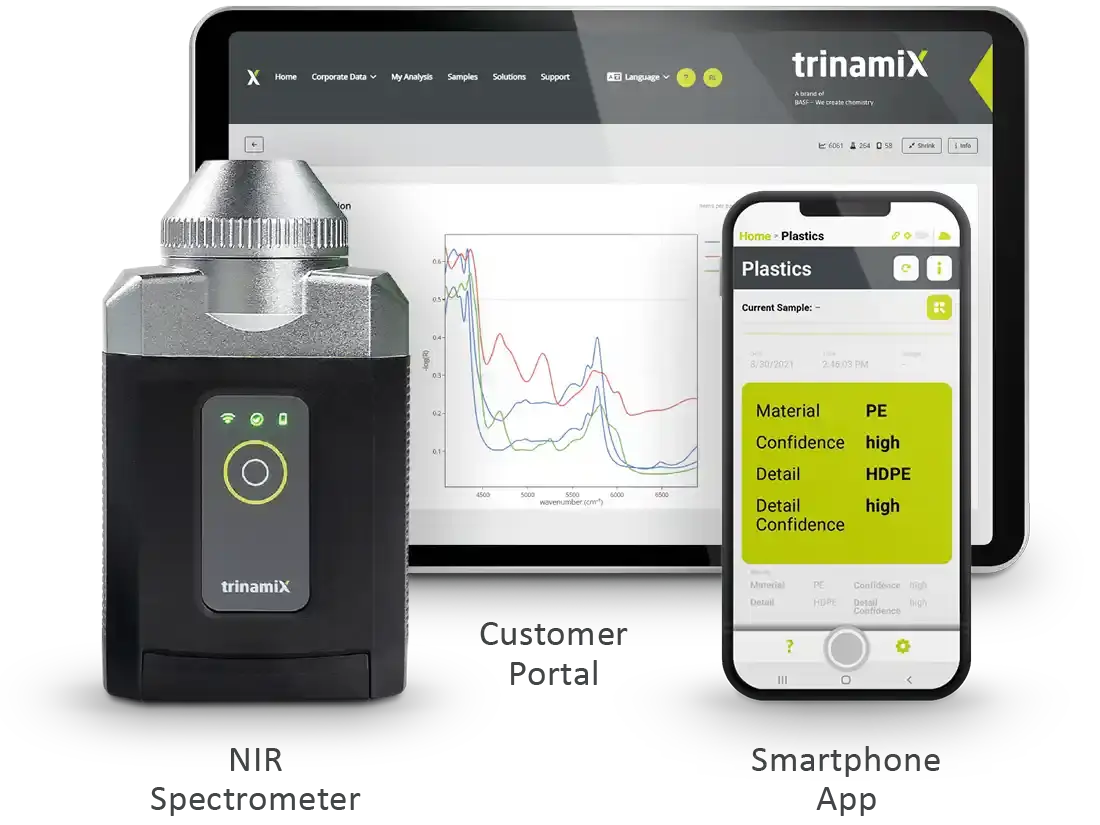 Het gamma van trinamiX omvat handheld NIR-spectrometers die een snelle identificatie van diverse kunststof- en textielsoorten mogelijk maken. Deze handheld spectrometers helpen bij het verbeteren van recyclingprocessen en kwaliteitscontroles, door materialen binnen de 5 seconden ter plaatse te analyseren.
